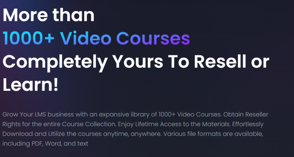 Grow Your LMS business with an expansive library of 1000+ Video Courses. Obtain Reseller Rights for the entire Course Collection. Enjoy Lifetime Access to the Materials. Effortlessly Download and Utilize the courses anytime, anywhere. Various file formats are available, including PDF, Word, and text